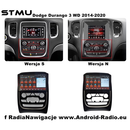 Wersja pasuje do Dodge Durango 3 WD 2013 - 2020 z wyposażeniem z radiem podstawowym. Nie pasuje do auta z radiem z ekranem 7.4" i panelem klimy od tej wersji. Do wersji z ekranem 8.4" pasuje wersja N lub radio dedykowane 8,4" STMU709JD w miejsce fabrycznego